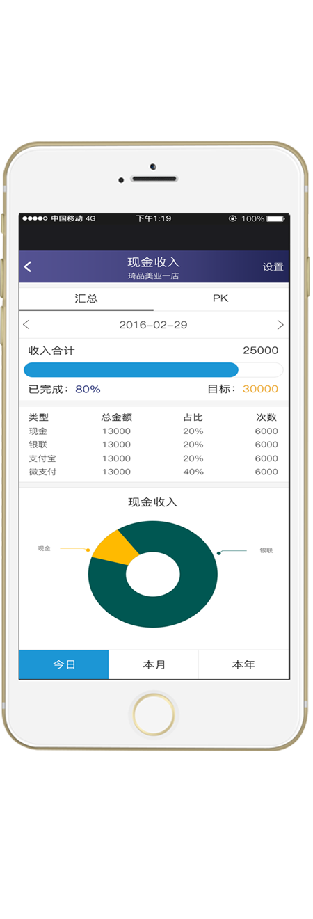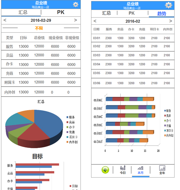 门店表现,时刻了如指掌手机业绩报表可向管理者呈现门店每日,月,年或指定时间段的门店营业报表,包括现金收入、服务业绩、划卡消费、卡项办充、疗程销售以及卖品销售,管理者可随时了解门店各项指标的表现及进展......