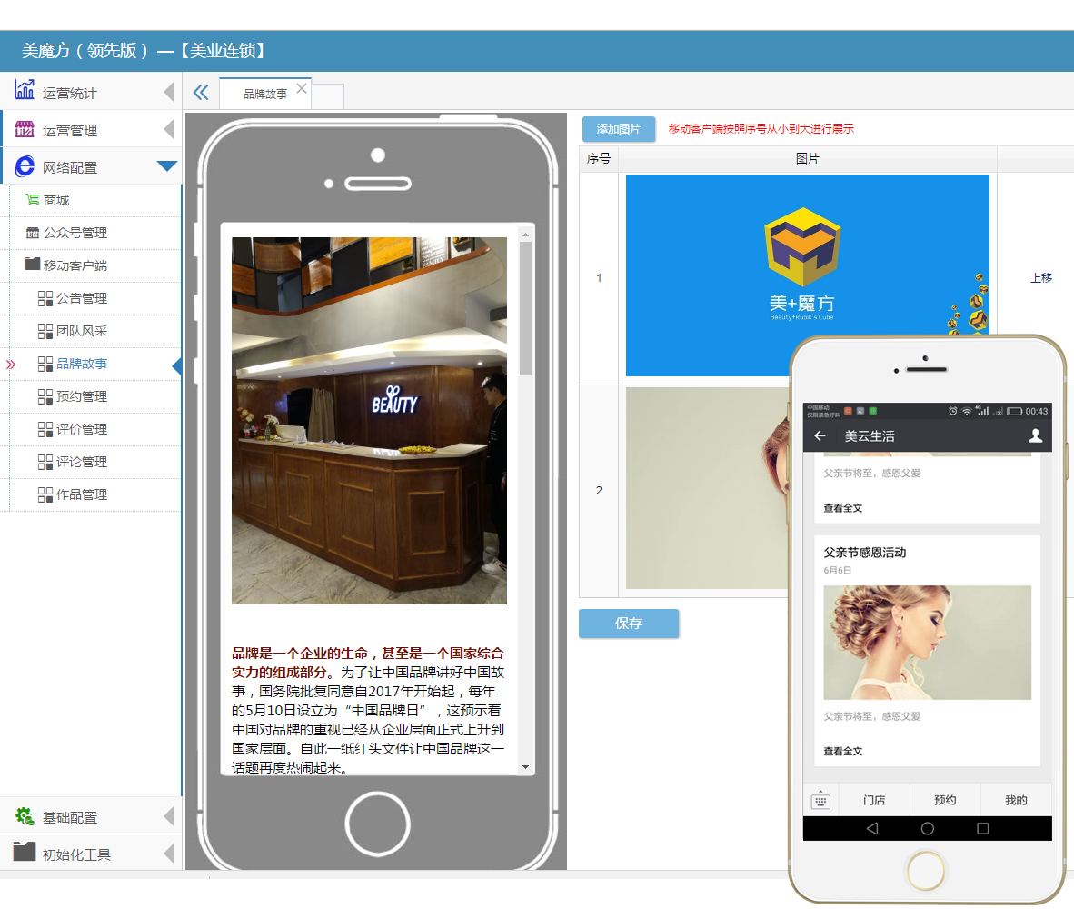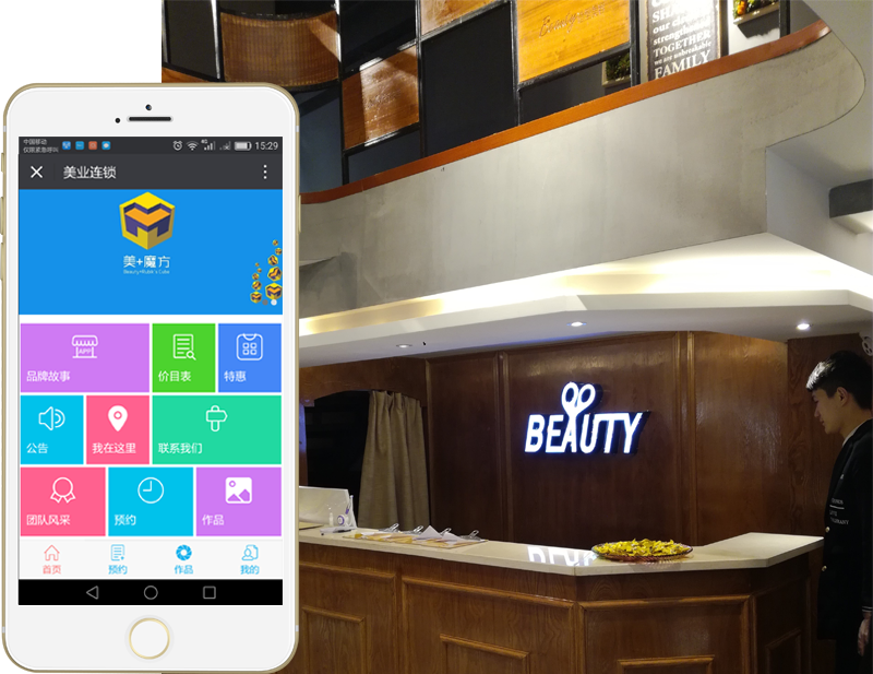 您只需要在美+魔方运营管理系统后台进行简单编辑,上传图片和文字资料,新老会员即可通过微信了解您的门店环境,地理位置,技术服务和员工信息,并可直接选择员工进行预约。尤其对于从未到过店的全新顾客,可更加直观地展示您的优势。