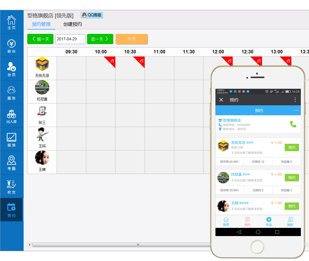 顾客可随时随地通过您的线上门店进行预约,选择好项目和指定服务员工,发出预约申请。员工同步通过手机端收到顾客的预约,确认后,顾客将受到微信确认。您只需要在美+魔方运营管理系统设定好员工每日的班次既可,顾客将会看到员工可接受预约的时间段。美+魔方运营管理系统还为您提供了预约提醒功能,系统可按照您设定的时间自动提醒当天有预约的顾客前来门店。