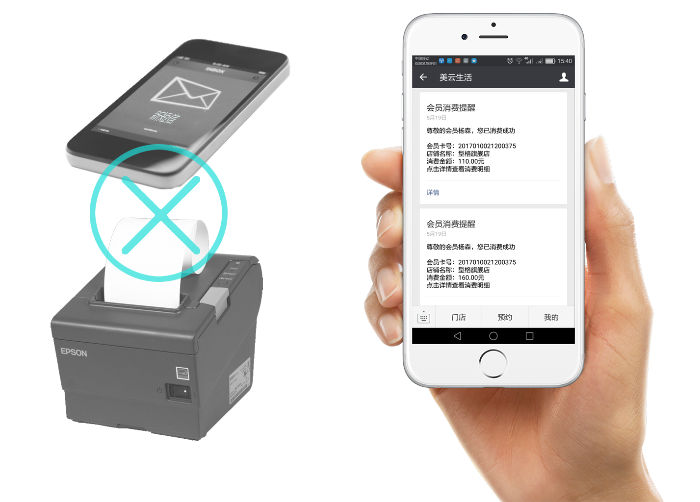 使用微信会员卡后,顾客与门店之间的消费凭证全部由微信消息来传递,您不再需要打印消费小票,也不需要发送短信消费通知,所有的一切都通过免费的微信消息功能完成,环保,节省成本,提升门店档次。